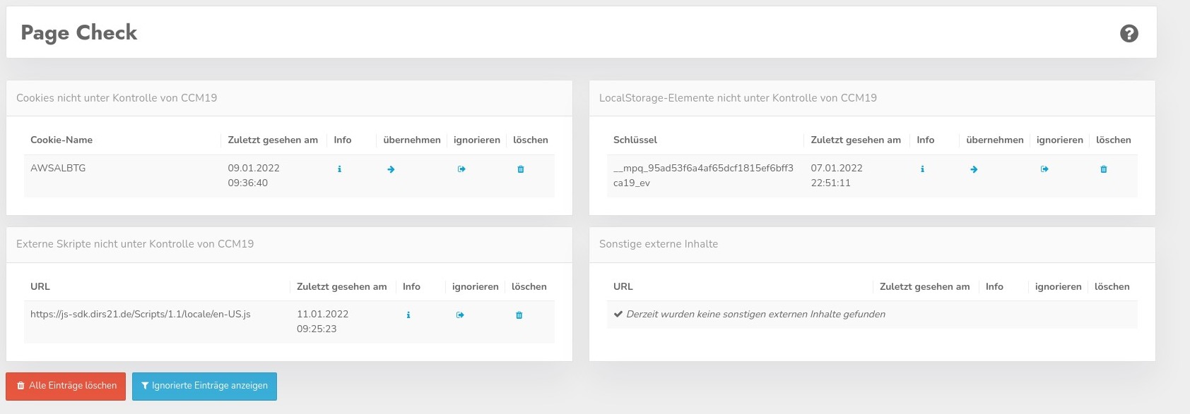 Der Page-Check hilft Ihnen, externe Skripte, Cookies und andere externe Inhalte zu finden bzw. zu kontrollieren. Die Tabellen zeigen Ihnen an, ob Cookies existieren, die Sie nicht kontrollieren oder ob Scripte außerhalb der Kontrolle vonClicksKeks ausgeführt werden.
